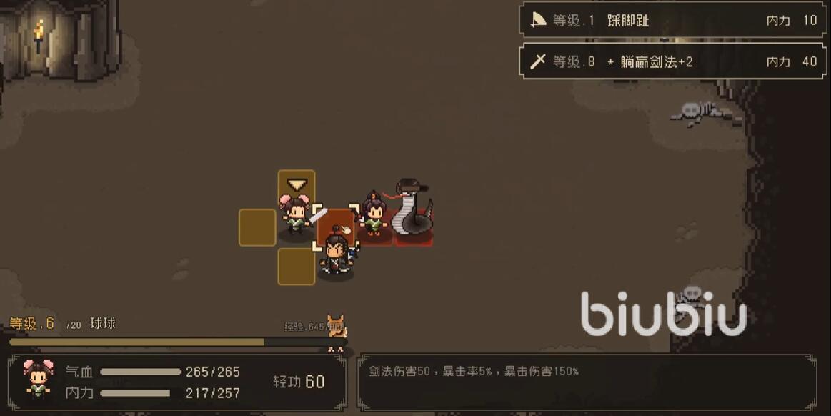 进入到第一回合的时候,建议小队当中必须要搭配上一个小黄狗,该角色可以每一回合帮助一个受伤的角色进行一定生命值恢复。然后控制角色们将蛇进行包围,随后使用一次天罗地网攻击,可以对蛇造成一个暴击伤害,同时也因为蛇的等级比较高,进攻的时候玩家们也将获取到大量的经验值来提升角色和武功等级。