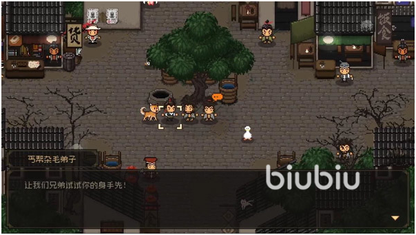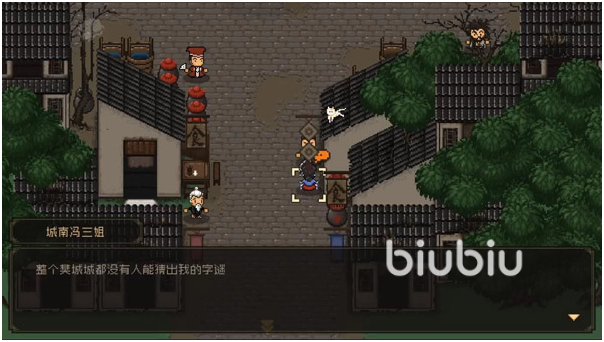 通过剧情介绍游戏的世界观和武林高手,神秘人留下钥匙然后离开。先搜索一下神庙佛像后面后面的,得到金币。出神庙,会看见一直狗狗,可以先不用理睬,去火堆旁保存一下。来到大地图,往右边走,进入樊城。来到中下方与城南冯三姐对话,猜字谜答案是“明,田,湖,伞”得到包子。
