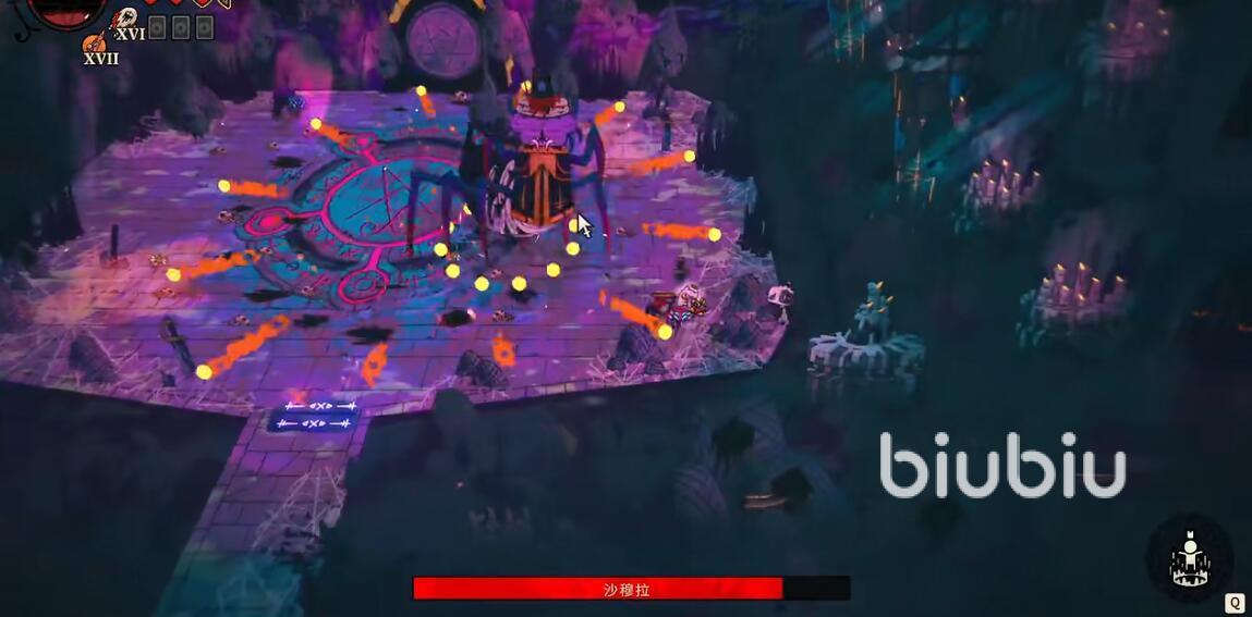 接下来,沙穆拉会进行多次冲撞进攻,并且在撞击的过程当中 召唤出大量蜘蛛小怪。这些小怪如果不及时清理的话,数量会变得越来越多,同时让玩家的走位也得到了限制。所以各位一旦发现了蜘蛛小怪,都应该第一时间将其清理掉。接下来,大家主要使用远程技能与沙穆拉进行战斗。