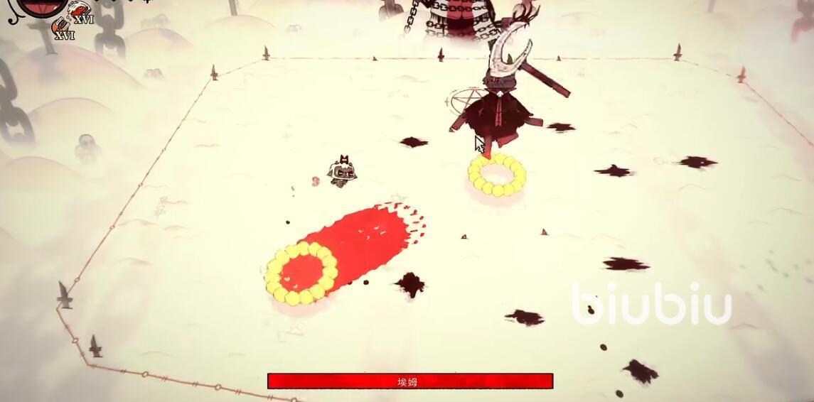 刚开局,埃姆会进入一个腾空的状态,随后使用大量圆圈弹幕对主角发动攻击,弹幕的速度很快,各位需要使用闪避技能来进行走位。然后直接走到埃姆的身后,这里不要使用普通攻击,直接施放三次以上的蓄力进攻,可以对埃姆造成有效的物理伤害。攻击结束之后继续闪避,敌人会持续施放多个圆圈弹幕进行反击。