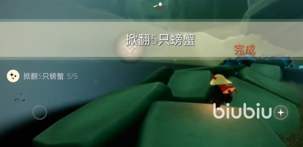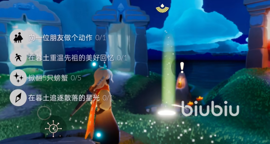 第三个任务玩家只需要在有螃蟹的地方,长按任务角色大叫,掀翻五只螃蟹即可。最后星光的位置在暮土一图废弃的亭子上方盘旋,玩家只需要靠近它,触碰到就可以完成这个任务了。