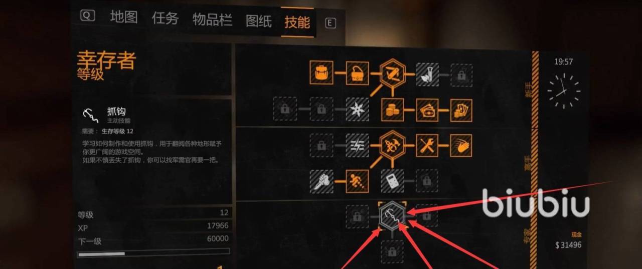 在幸存者技能图标中,只要幸存者等级达到12级就可以开始学习抓钩技能了。我们进入游戏后,打开背包界面,随后点击幸存者技能。在幸存者技能界面中,选择升级抓钩技能,然后在升级弹出框内点击确定升级抓钩技能,或者回车确定升级就可以使用抓钩了。