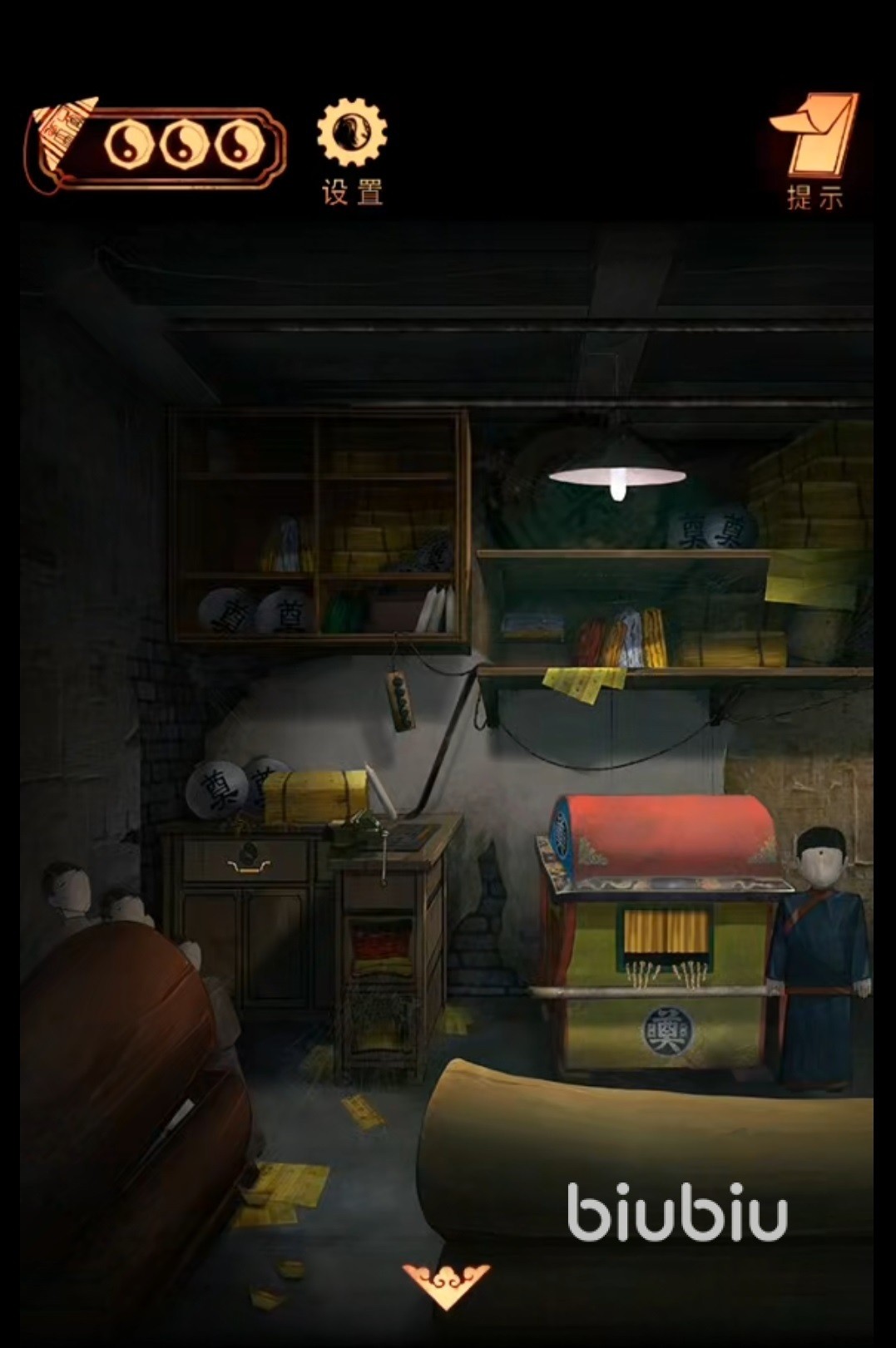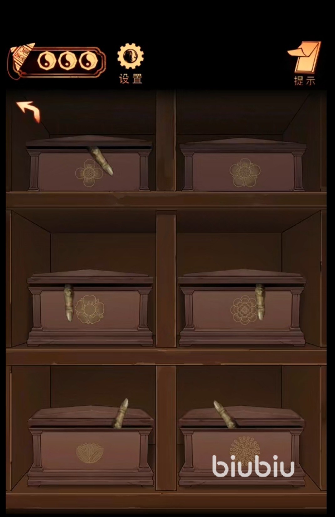 使用这把钥匙能够打开柜门取得一锅糖,将糖放到之前用过的煤炉上能够得到糖水,只用糖水可以完成糖画。这里会进行一个一笔画的小游戏,画好的糖画交给丧葬店的小女孩。根据手指的方向依次点击骨灰盒会出现不同的图案,这些图案就是仓库门锁的密码顺序。打开仓库的门锁,找到撬棍后撬开棺材,拿出里面的纸人,将纸人放到轿子的左边。