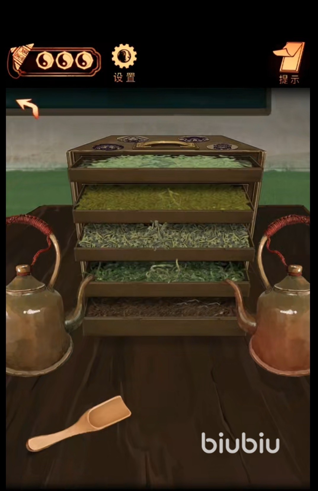打开茶叶箱需要根据茶杯上花纹的顺序来依次点击,打开之后将开水和杯子放到桌子上,添加茶叶就可以得到泡好的铁观音和龙井。泡好了茶递给客人之后前去理发店。拾取看到的树枝、玻璃罐、剪刀和竹筐,然后打开柜子上的抽屉可以得到梳子和镊子。镊子用来抓住柜子里的虫子,然后走到镜子旁使用梳子可以得到打开玻璃箱的密码3018,打开玻璃箱后可以取得蛇蜕。