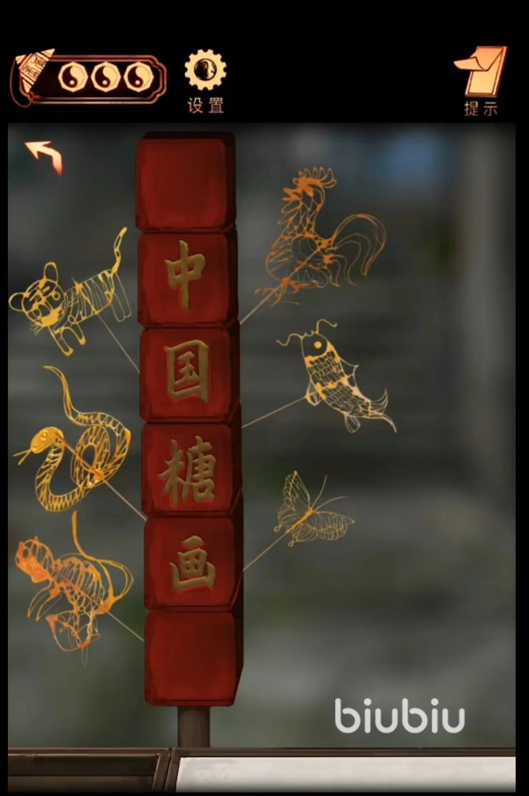 接下来使用剪刀将丧葬店上的白布条剪下来,再返回到茶馆中,打开鸟笼子,需要在地上将竹筐,树枝,白布条和装了虫子的罐子依次摆放好,组成一个陷阱。这里还需要完成一个小游戏之后就能够得到鸟羽毛。再前往丧葬店和里面的小女孩进行对话,观察糖画的高低顺序,依次点击对应的图案,就可以得到一把钥匙。