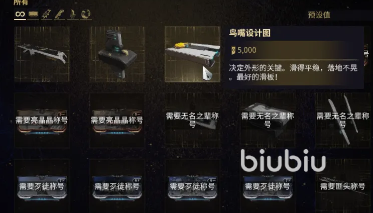 获得足够的声望之后,就可以寻找洛奇兑换滑板的设计图了。想要组装一个滑板,需要集齐四个部件。分别是板身、反应器、板头和喷射器。4个部件的品质都好的也有差的,玩家可以在声望商店中进行兑换。当然,越贵的部件滑板的性能越好,外观也更加华丽酷炫。