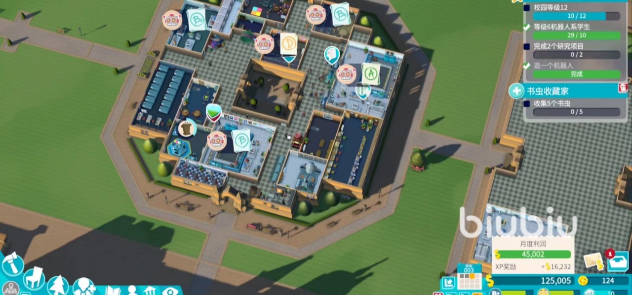 该章节玩家拥有350000的起始资金,米顿大学主打现代化的校园建设。开局玩家需要创建机器人的学科,同时建设机器人建设教室、阶梯教室和机器人老师。其中机器人建设教室的面积尽可能的大一点,后面需要在里面装很多设备。