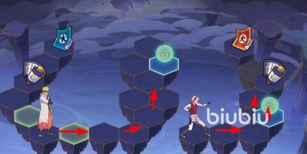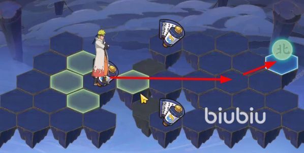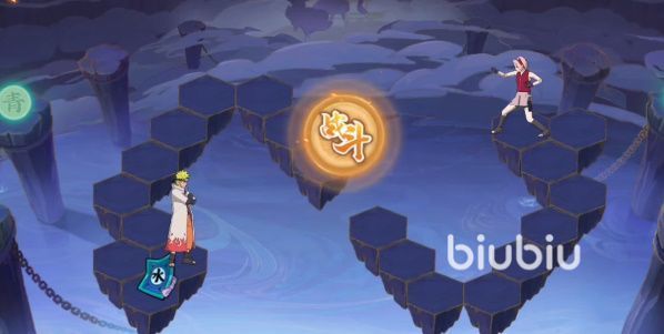 第3关刚开始就需要摇晃一下手机,可以直接触发第3关的彩蛋,获得隐藏成就。等到格子掉落之后会看见有三个不同的道路,此时继续摇晃手机,能够将地图中的火格和冰格全部震碎消失。将鸣人移动到左侧的时空卷轴上,此时可以改变格子的布局。之后按照下图的指示,将名人鸣人和小樱移动到指定位置就能触发战斗,击败boss之后通关第3关。