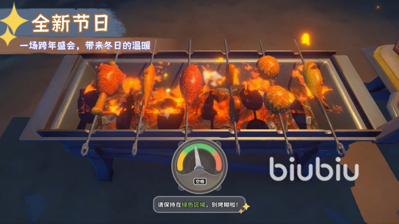 还增加了一个新的节日冬日节,在即将到来的冬季可以围绕篝火一起跳舞,然后进行开心的烧烤野餐。其中烧烤部分需要自己动手完成,下方将是一个控制操作的按钮,如果一不小心就会将食材烤糊,这将非常考验反应速度和眼力。
