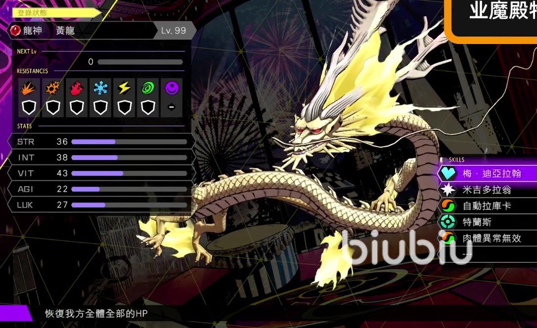 黄龙是一开始就能特殊合体的恶魔,这个恶魔等级要求非常高,前期不太能合出来,但是中期合成出来之后就会非常强势,这个恶魔对所有属性都带识破,在前作种,这个恶魔是一个辅助类型的恶魔,这一作也不例外,这个恶魔自带一个梅-迪亚拉翁(恢复我方全体所有血量),米基多拉翁(以万能属性对所有敌人造成大量伤害),自动司库卡(在战斗开始3回合内,我方全体的防御力上升),特兰斯(在使用回合内,使对象的火焰,冰冻,电击,冲击属性的蓝量消耗增加2倍,伤害增加1.5倍),以及一个肉体异常状态免疫(完全不陷入中毒,麻痹,畏惧以及炸弹状态)。