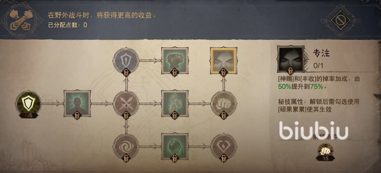 第2套是硕果累累,这一套天赋适用于在野外战斗,因为有了苦练、神赐和点金三个秘技,所以在击杀精英怪能够获取高收益,无论是经验还是掉落魔法装备的概率都大大提高。具体的点法是从护甲开始,先往上点出神赐,然后往右点一直到点出专注就可以了,一共需要54点天赋点数。