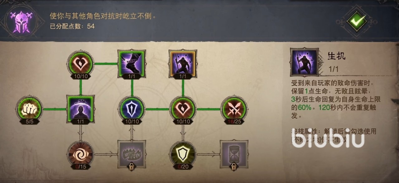 第3套是不败之地,适合喜欢进行pvp的玩家,这一套中拥有免控、受控缩减和生机这三个秘技,具体点发是先从破甲开始,往上点出生机,最后将伤害点满。生机可以在受到致命伤害时,保留一点生命值,在短暂的时间内将会无敌,并且后续持续恢复血量。受控缩减的效果是降低受到控制时的持续时间,在PK中短短的几秒钟就能起到决定性的效果。