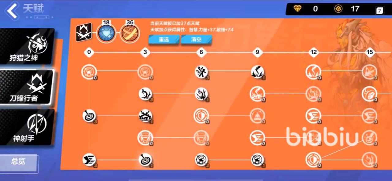 2、天赋选择:狩猎、敏锐、、世事无常或者行色匆匆都可以、蜂鸣、神射手、狂风、一箭三雕。