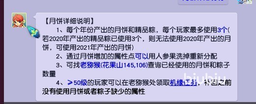 关于月饼这里还有一个补充的说明,在花果山的老猕猴处,可以查询到当前角色已经吃下的月饼数量。如果在之前的活动中没有吃足够的月饼,还能够通过机缘任务进行补救。除了自己活动获得外,月饼还能够用于交易,所以想趁这个机会赚一些梦幻币,也是不错的选择。