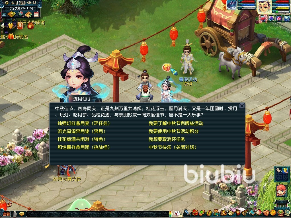 在中秋节时吃月饼,是中华民族古老的习俗,在梦幻西游中也不例外。从今天起一直到9月13日中午12点,期间凡是大于30级的玩家都可以组成队伍去长安城流月仙子处领取活动任务,只要完成任务就能够获得大量的物品和游戏内货币,奖励并且每一环任务在完成后还能累计一点中秋节积分。
