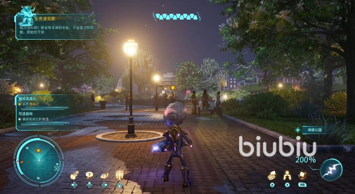 战斗的地点由于是公园当中,周围将有大量的市民出现,为了不在攻击的时候消灭无辜的人扣分,建议大家将敌人进行标记,这样才可以在混乱当中快速找到对手。随后玩家们只需要利用电击枪瞄准敌人进攻即可。敌人的进攻手段很单一,玩家们可以使用飞行器从空中发动进攻,这样就可以顺利的将其打败。