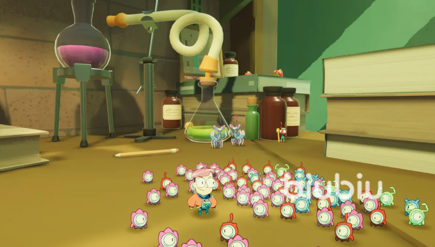 先去找大螳螂乱心智,到了无常绿园以后,我们可以看到一片像实验室的地方。四处都是绿植,还有很多超大的盆栽。还有大大的生态箱。紧接着乱心智会告诉你,他才不会告诉你他把钥匙藏在了生态箱底部。这里能看出来大螳螂是真的很傻。果然不愧叫乱心智。开始前还是要多收集一些小眷灵,新的小眷灵是绿色的,这些小眷灵可以堆叠在一起,还挺有意思的。