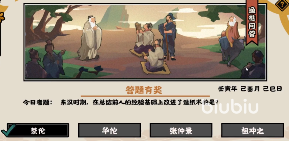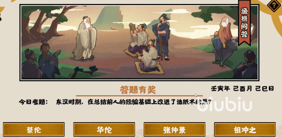 这次的渔樵问答题目是:在东汉的时候,是谁在结合了之前制造方法创造出了新的造纸术?