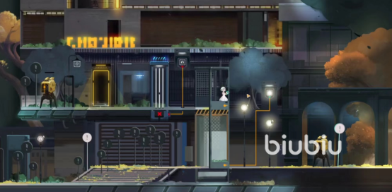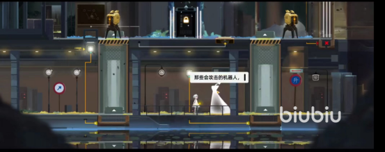 游戏玩到这里,其实老玩家们可以发现,在难度以及解谜的复杂程度是有了一个显著提升的。回到站台,同样是在数据中心的位置选择和机器人进行对话,这里你会发现他提示你一定要注意机器人的巡逻路线。点亮面前三盏灯以后,你会发现楼上楼下都有巡逻队。这时候你先站到升降电梯那里,等到两个机器人走到最左边,乘机下楼向前。