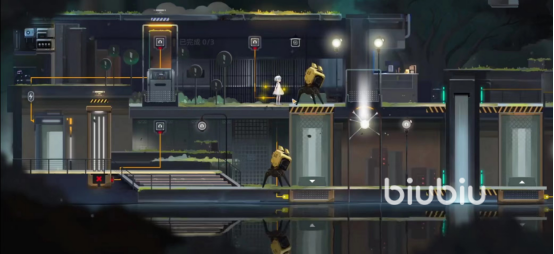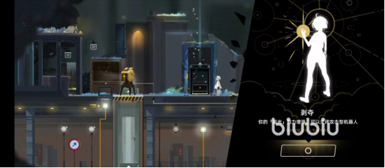 来到前面你会发现面前刚好堵着一个机器人,还是点亮头上三盏灯,打开电梯,再上二楼。左边的黄色小门点亮,顺利进入。npc发光小鹿继续出现,提示你楼上上锁机器的作用,顺便解释了巡逻机器人的来由。还是先打开升降梯,上二楼,打开上锁机器。获得剥夺能力。剥夺能力就是主角的吸光能力增强,然后可以强行停了巡逻机器人,直接让他们关机。这个技能还挺流氓的。到这里没什么难度,不过每个机器人身上也会有一个光源,记得收集。