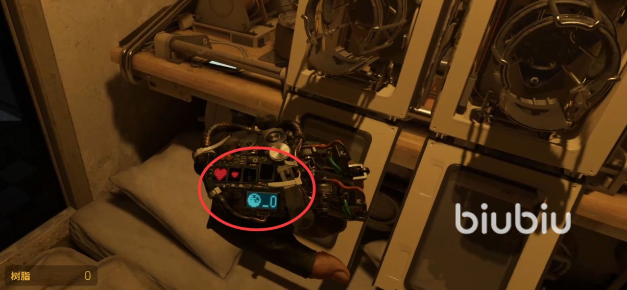 从罗素那里得到一个重力手套,会有不同的图案代表不同的数值,其中蓝色的数字就代表着已经收集到的树脂数量。如果拿起枪支,该数值就会变为剩余的弹药量,非常好用。
