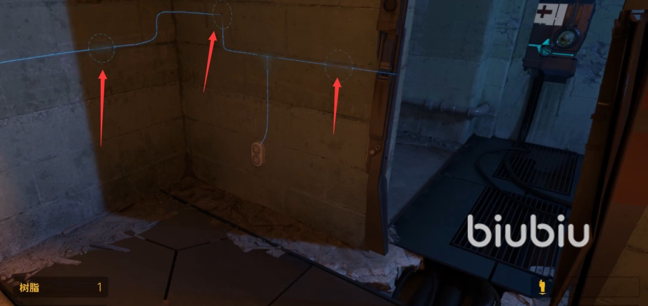 从现在开始树脂的数量将会非常多,其中还有一些隐藏于周围的柜子里或角落里,所以一定要多翻多看,不然漏掉的都是我们的损失。在下楼之后找到一个可以看到小老鼠的窗户,越过之后按住摇杆键能够进行工具的切换。此时需要使用到多用工具,用于在墙中扫描各种电线,颜色表示接通状态,如果是蓝色则表示已经接通,黄色表示没有接通。