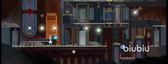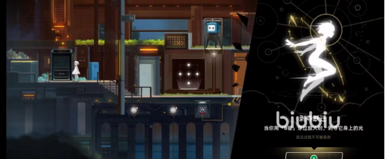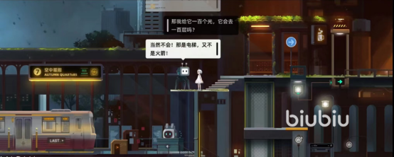 依然是乘坐巴士来到新的站台下车。我们径直走向源。上面会提示你光的数量决定了楼层。乘坐升降梯上顶楼点亮门。回到小npc处修复它。这是向导机器人701。它继续为做出这一关的简单介绍。前方区域是特有的高层光控电梯。它会根据启动电梯的时候能源数量去决定你会抵达的楼层。比如说你给电梯一个光,它就带你去一层。这里还有个小玩笑,挺萌的对话。