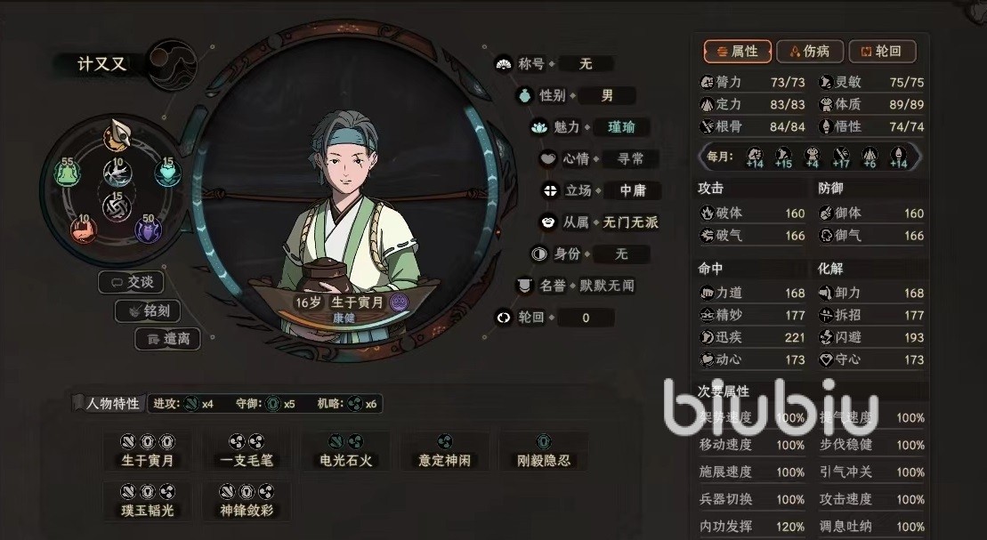 璞玉韬光,提高的是艺技类书籍的研读效率,效果没有上一个好,所以评分只有3分。天材地宝,就获得软硬铁、软硬木等道具,打分评分2分。先利其器,随机带来制作工具,利用这些工具可以制作不少好装备,评分三分。天人造化,提高身法和绝技的资质,这是目前评分最高的一个特性,达到了5分非常重要,直接影响的战斗力。古冢遗刻,能够获得一本功法书种类和选择的初始门派有关,还有一本技艺书。