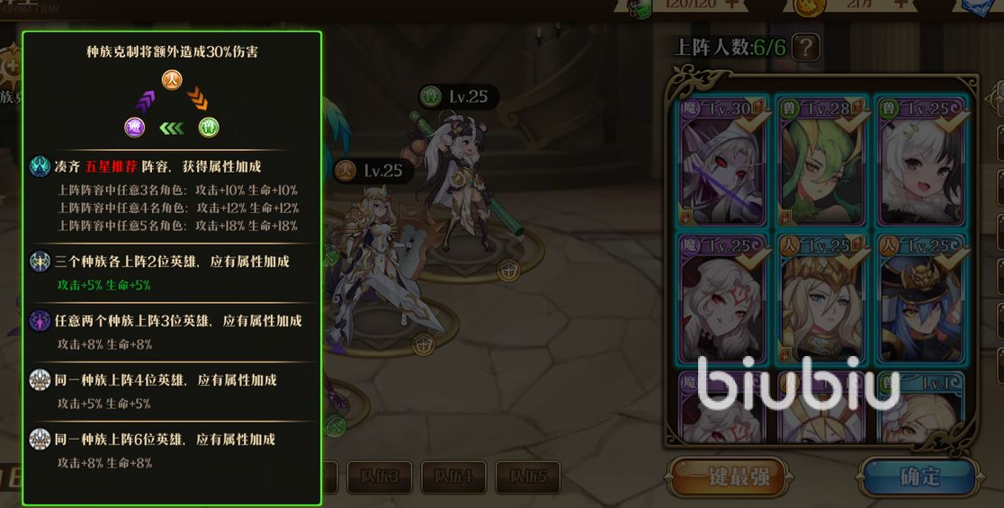 知道职业以后还要把英雄的种族分清楚,种族对于阵容的搭配也很重要。目前拥有的种族是人、魔、兽三种种族,当同种族的英雄同时上场的话就会触发种族力量,让队伍获得特别的加成,提高战斗属性。