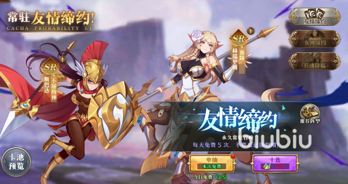 游戏里面最常见也是最普通的抽英雄方式,每天玩家都能获得5次免费友情缔约,抽取的时间间隔为10分钟。