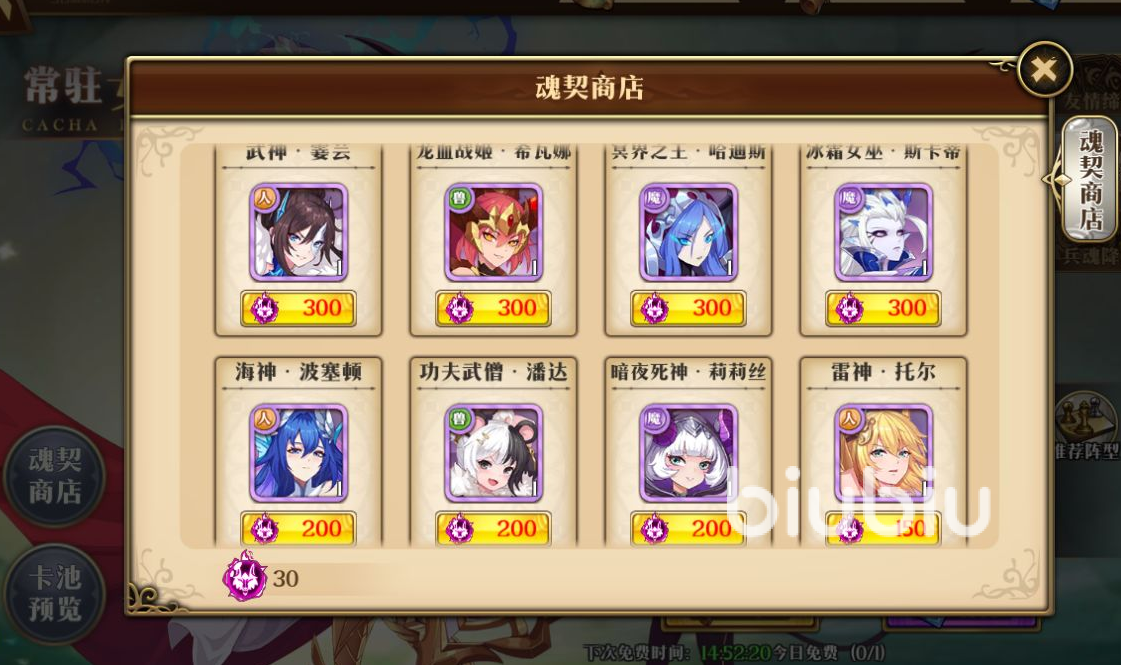 每天有一次免费抽的机会,累计30次必抽到一个SSR。每次抽取除了有机会抽到英雄跟材料以外,还能获得额外的魂契。
