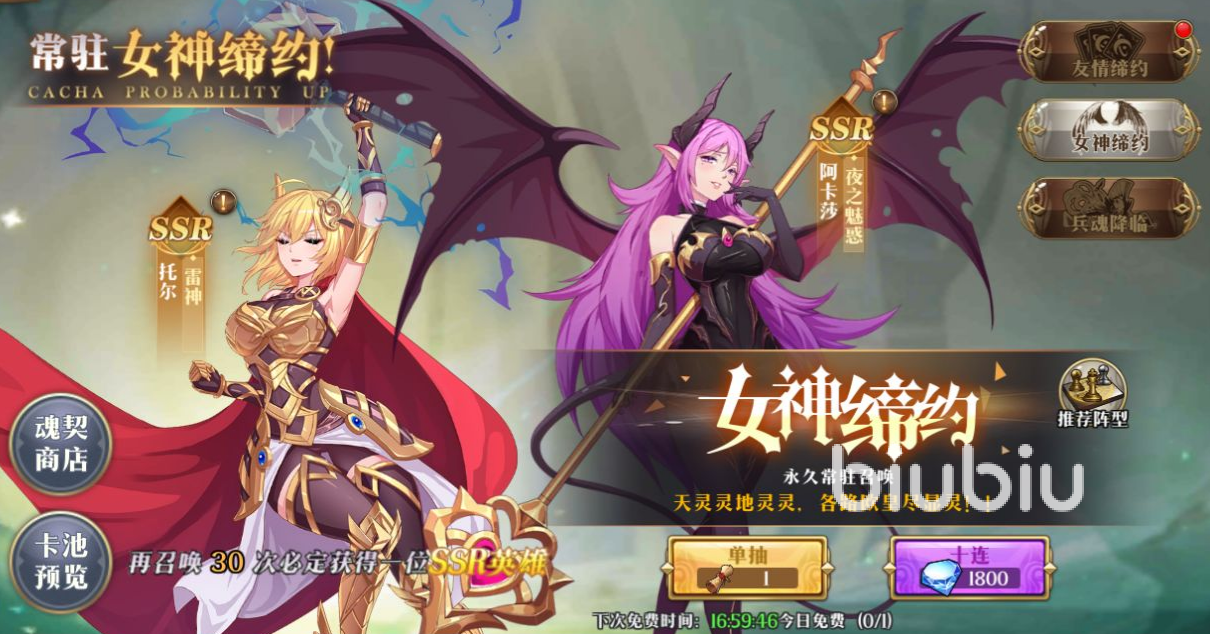 同样也是限时的缔约,但是是建立在女神缔约的基础上的,当使用女神缔约达到一定次数以后就会开启兵魂降临,那么抽到SSR的机会就会变大,并且里面获得的魂契可以跟女神缔约的魂契数量累计。
