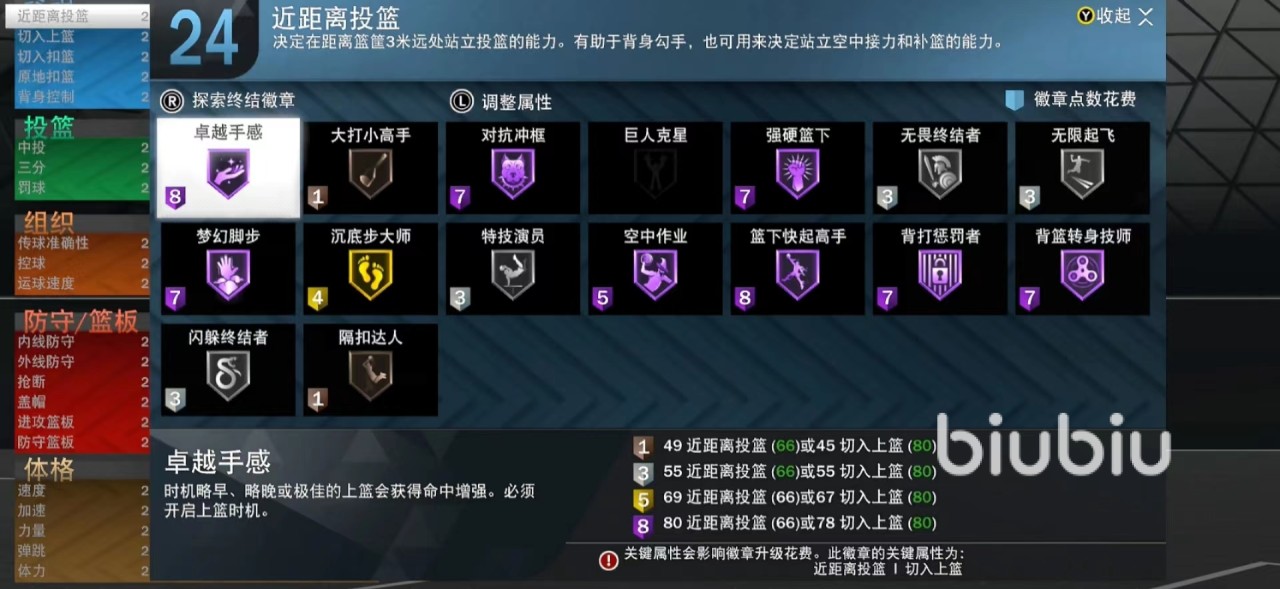 如果玩家喜欢玩技术性,比如会勾手、背打等等,身体素质方面可以稍微下降一些,转而提升一下租住能力和终极能力,另外臂展对于技术型中锋依然非常关键。