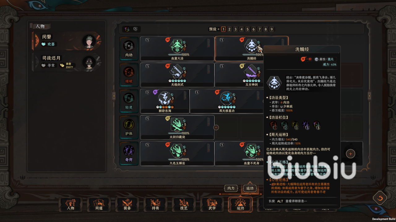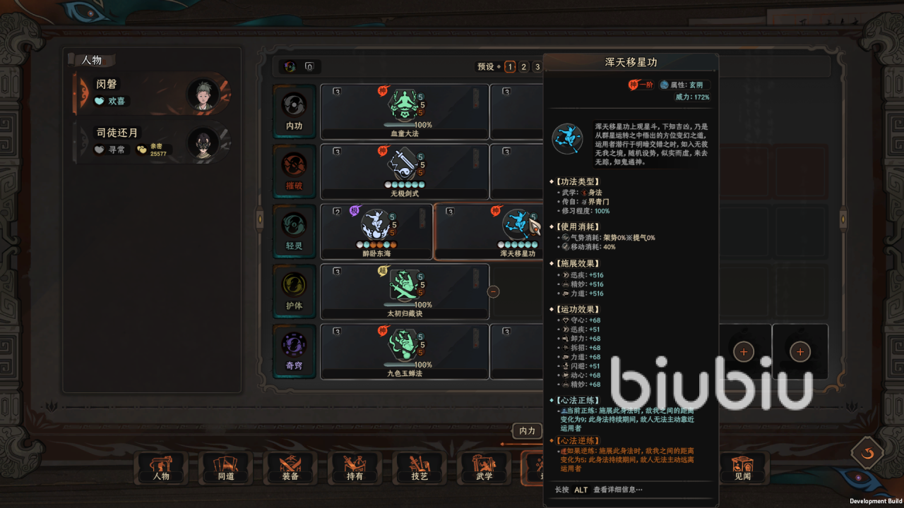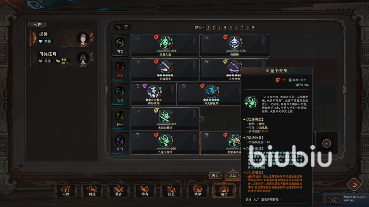 在峨眉派有了一定的声望之后,将猿公剑法替换为玉女剑法,这个是其中一个重要武功,然后去界青门学一品功法浑天移星攻,我们这个毕业bd都是神一品功法,对玩家的要求较高,但是我们可以通过偷窃的方式将这些功法收入囊中,学完这两个功法之后,顺路去伏龙坛学醉卧东海,学完之后回武当拿无极剑法,这套bd就成型了,这套阵容的玩法需要我们逆练醉卧东海,这个功法的特效是,玩家在喝醉的情况下,即使未满足技能释放条件也能释放技能,释放的技能按照缺少的比例减低伤害。