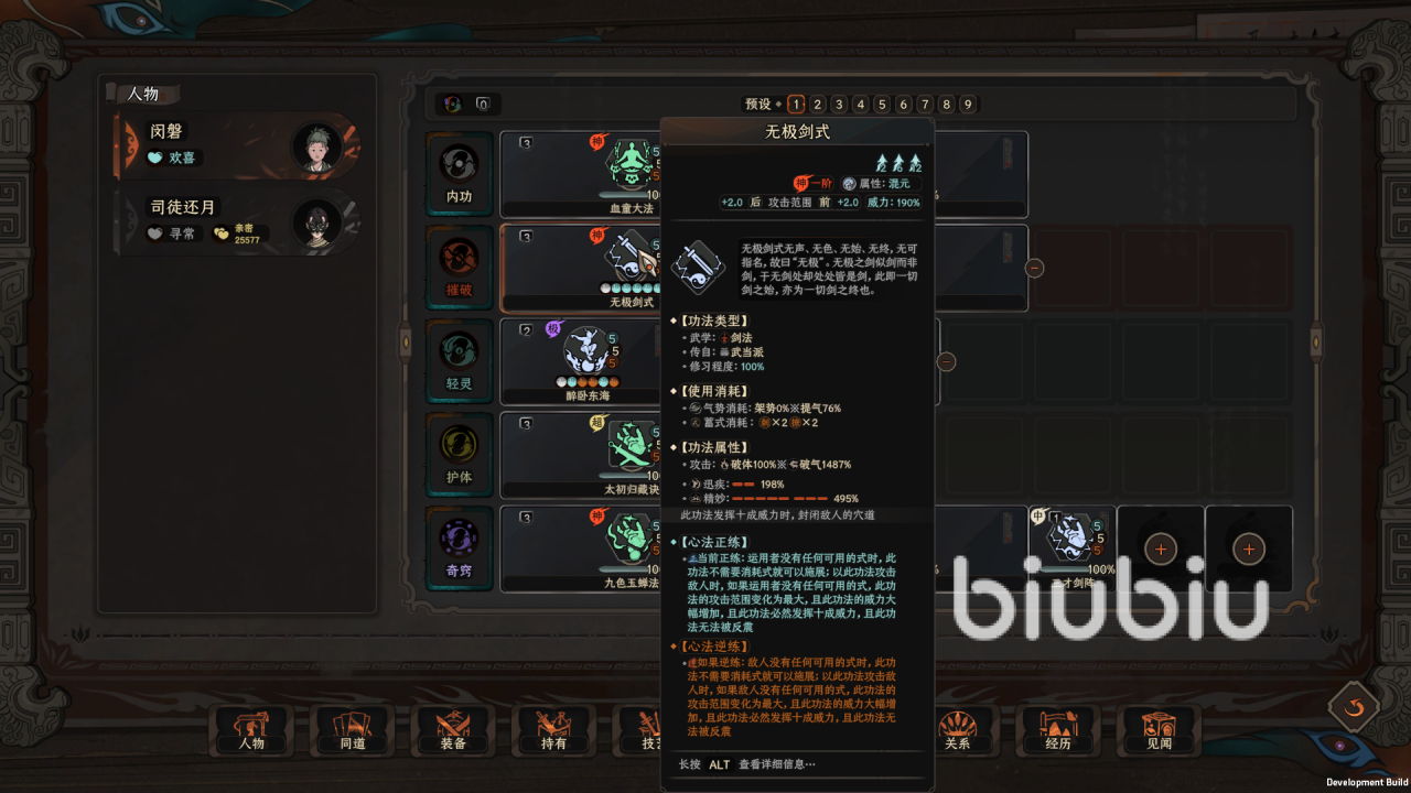 玩家一个月喝一次酒就可以,然后战斗方面,玩家装备一件4刺的武器,要前面4个式都是刺,不然是不能触发无极剑法的,开局直接普通攻击攒出4个刺,然后直接使用玉女剑法,一次过后,在使用醉卧东海,就可以实现无极剑法永动机了,这个bd对面基本是没有还手之力的,只要玩家注意好自己的武器耐久就可以了,然后每个月战斗喝一次酒即可,其他也没什么特别重要的,功法万用格还有其他多余的可以搭配狮子吼逆练,十三太保横练功逆练。
