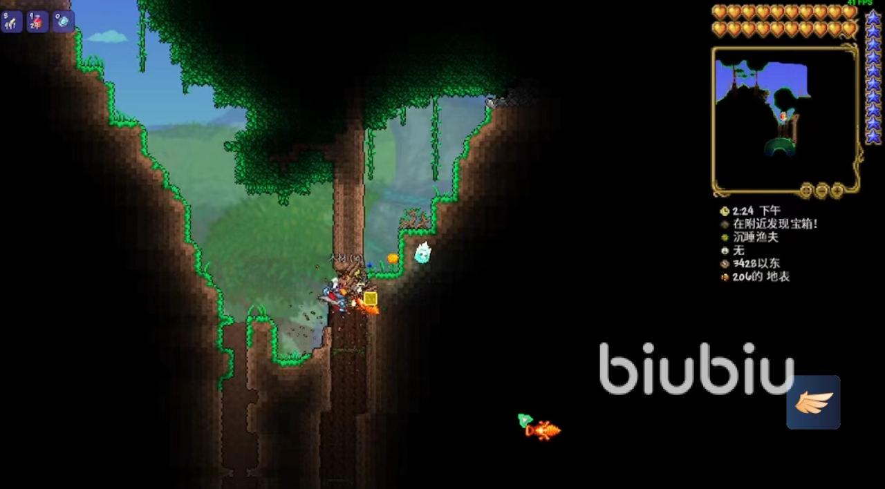 3、找到大树后,沿着大树的根部乡下挖,就可能就能来到一个小洞穴中。这里四面有水中间有一块石头,跳上去就能取出附魔剑了,这也是为什么被称之为石中剑的一个原因。