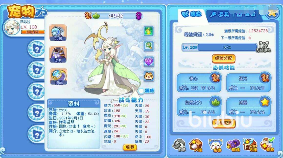 总之,伊瑟拉的整体定位就是一个魔法伤害的输出宠物,战斗能力强大的同时,自身的防御技能和恢复能力也不错,各位可以将她指派到各种副本去进行挑战。帮助玩家提高获取各种稀有道具的概率,同时也可以用于其他宠物的抓捕任务中。
