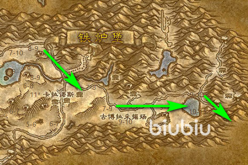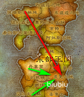 由于联盟玩家和部落玩家的行进路线会有所不同这里就分开介绍了,上图中红和绿分别代表部落和联盟的路线,大家根据自己的位置选择最佳的路线。