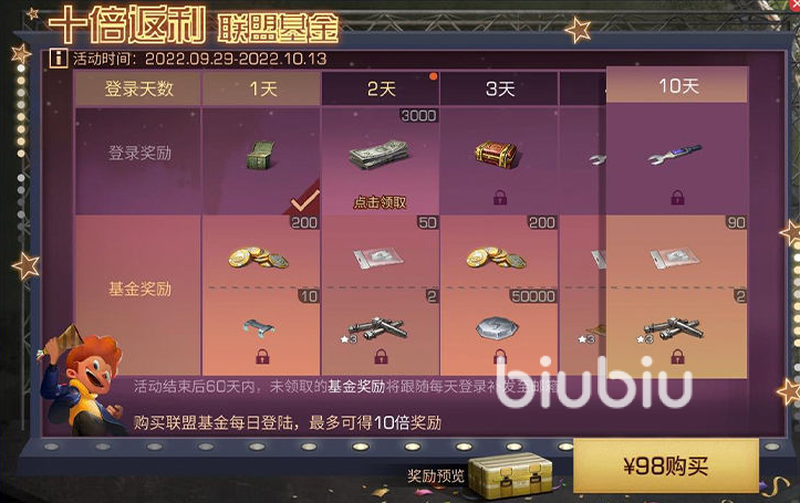 第三给活动是联盟基金,活动时间是从13号开始,活动开始后每天上线可以领取精美礼物之外,要是买了联盟基金就会给大家返还2100的信用点了,还有很多技能点以及其他奖励哦,玩家最多可以领取到最多10倍的奖励,非常划算。