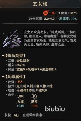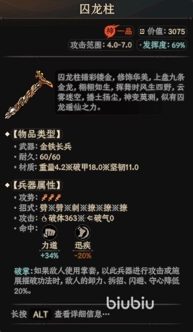 第二把是囚龙柱,这把武器攻击距离稍远达到了4~7,材质为重量4.2、破甲18坚韧11,能够进行劈、刺、撩的连续招式攻击。在命中时会增加34%的力道,可以很好克制对方的拳掌类兵器。