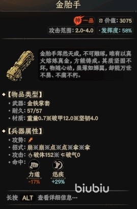 第三把是金弦乱,攻击距离达到了4~7。材质方面重量非常轻仅为0.7,破甲4.6,坚韧3.7。使用弹的方式来进行连招攻击,命中可以增加精妙。第四把是金胎手,近战武器攻击范围为2~4。重量为0.7,破甲12,坚韧4.0,使用崩、点、拿作为连招输出,击中后可以增加迅疾。