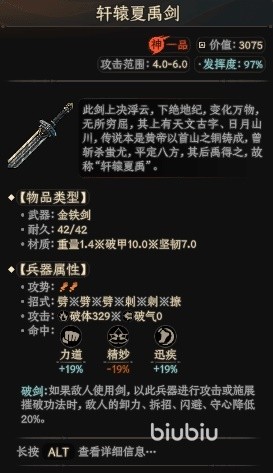 第十一把是轩辕夏禹剑,重量1.4,破甲10,坚韧7.0,命中可以增加力道和迅疾,是皇帝的武器,非常有效的克制对方的剑类兵器。最后一个是金蝉剑,剑身非常薄非常飘逸,重量0.6,破甲9.8,命中可以增加大量精妙。