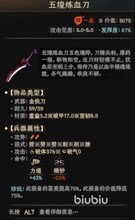 第一把是五煌炼血刀,这是一把偏近战武器,攻击范围在3~5之间。刀锋非常尖利。在材质方面重量为3.2可以带来1.7的破甲和8.5的坚韧,使用该兵器能够进行连续劈砍和刺杀的攻击,当命中时会增加43%的力道。