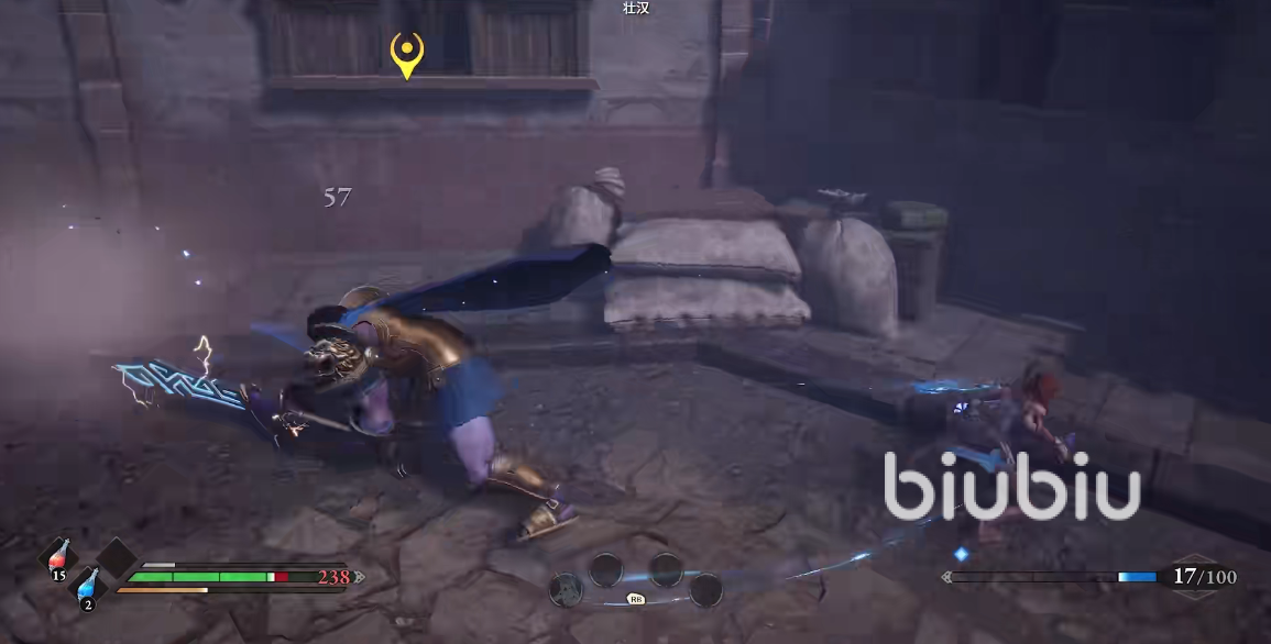 首先,壮汉出现的地点位于玩家们刚进入主城寨的路口,大家可以发现敌人明显身穿一套重装防御装备,同时在触发了对话之后,就会立刻对玩家们展开攻击。小编建议大家在对话结束的一瞬间,立刻控制角色快速向后进行撤退,这样可以避免壮汉发动的一次重击,被击中的话将承受大量的伤害。