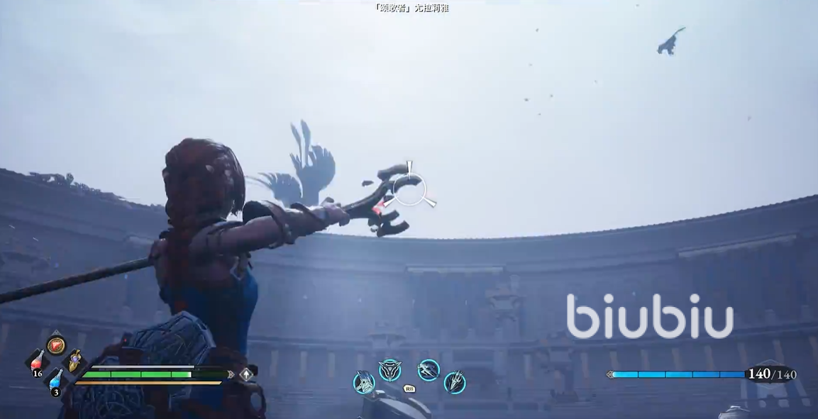 一旦进入到战斗状态,敌人会在空中不停的飞行,这一阶段玩家们就直接切换远距离攻击状态,不停释放魔法技能去对颂歌者造成伤害,基本上可以有效的消耗对手四分之一的生命值。不过,敌人随后就会对玩家们进行反击,通过飞行快速的缩短与玩家的距离,同时在空中释放大量的羽毛对下方的主角进行攻击。