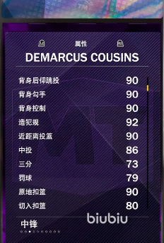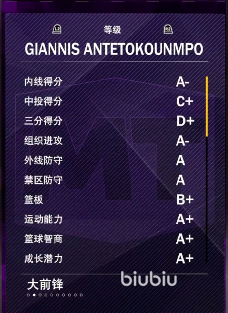 这就是不少人熟悉的“字母哥”,90总评87进攻92防守。出生于94年身高达到2.11米,司职前锋,效力于雄鹿队。数值上可以说是相当不错,基本没有什么短板,特性上也有非常好用的对抗冲框和无畏终结者,强行上篮能力不错,投射能力也还行。不过如果你玩了就知道“字母哥”的投篮动作不是那么好按,需要一些时间适应,还是有些不一样的感觉。