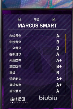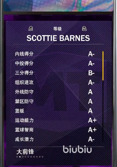该角色有着90的总评分,89进攻和90防守。斯科蒂·巴恩斯出生于2001年,算是小将,效力于多伦多猛龙队。是上个赛季的NBA最佳新秀,大部分数值方面都是A和A-,三分达到77评分,中投达到82评分,近距离投篮达到82评分,数值太多小编不一一描述了,具体的可以去游戏中查看。特性方面有闪避终结者和中投王者,还算比较好用的。