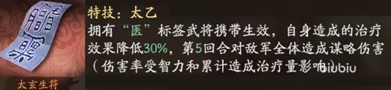太乙它的定位主要就是治疗,与士别三日差不多,太乙主要是针对那些治疗有些溢出的武将的,可以把溢出来的一些治疗转换成伤害。