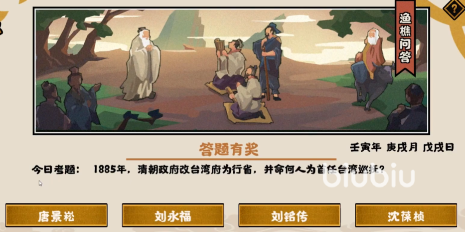今日要作答的题目是:在一八八五年的时候,清政府将台湾府改为行省,当时是让谁前去担任台湾首位巡抚的?
