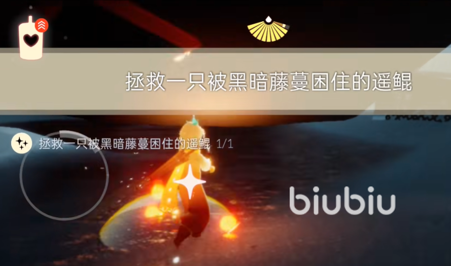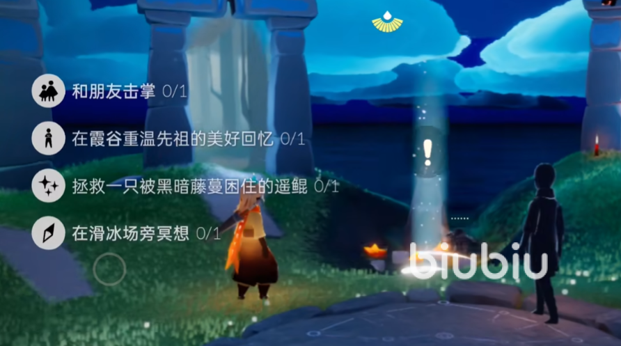 在霞谷还有一个要做的就是回溯先祖了,这位要重温的先祖是在穿过滑行或是飞行赛道最终处,进来这里后直接往左前方的神像后面飞去,在那里便是此次的目标先祖了,举火将其点亮后就可以再次进行收集,全部看完后完成此项任务了。